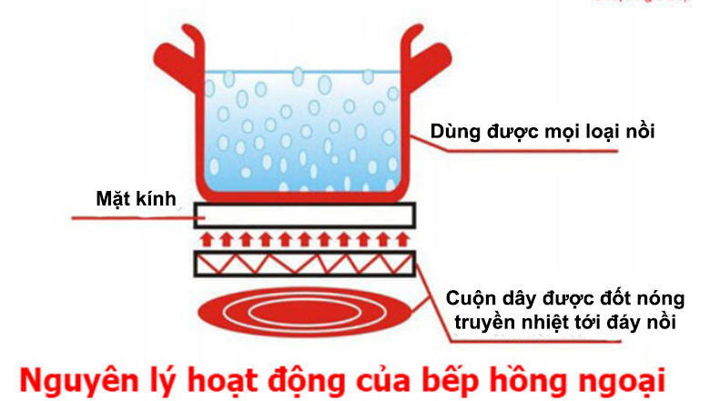 Khi bếp được cấp nguồn điện, dòng điện sẽ chạy qua các mạch điện tử và thắp sáng các sợi dây carbon. Lúc này, sợi dây sẽ bắt đầu nóng và tỏa nhiệt độ, đồng thời thấu kính hội tụ được lắp đặt bên trong mặt kính sẽ tập trung năng lượng vào vòng tròn đỏ (mâm nhiệt) để tiến hành truyền nhiệt làm nóng đáy nồi, chảo được đặt lên mặt bếp, nhờ đó mà nấu chín được thực phẩm.